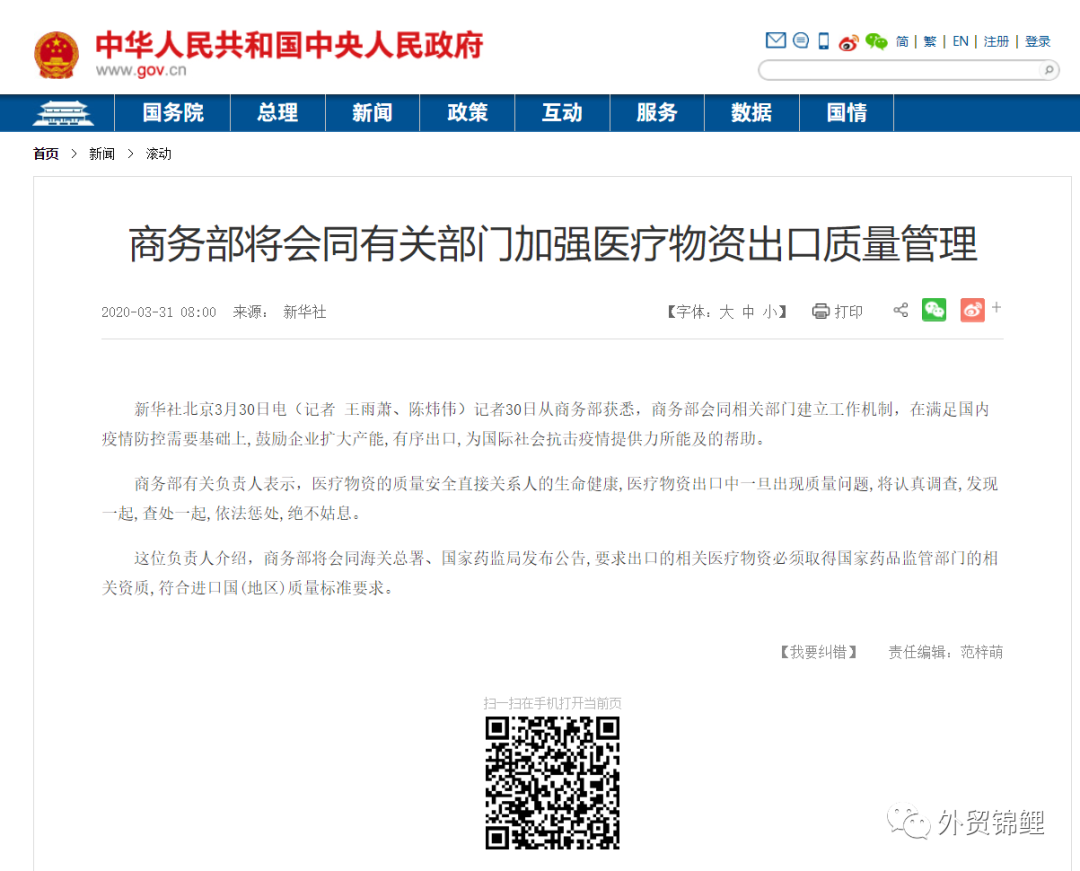 鑒于以上種種情況,商貿(mào)部為了規(guī)范醫(yī)療產(chǎn)品行業(yè),尤以口罩產(chǎn)品為主,已經(jīng)宣布對當前醫(yī)療物資出口增加必要的超常規(guī)管理,督促企業(yè)以更加負責任的態(tài)度接單生產(chǎn)并出口。