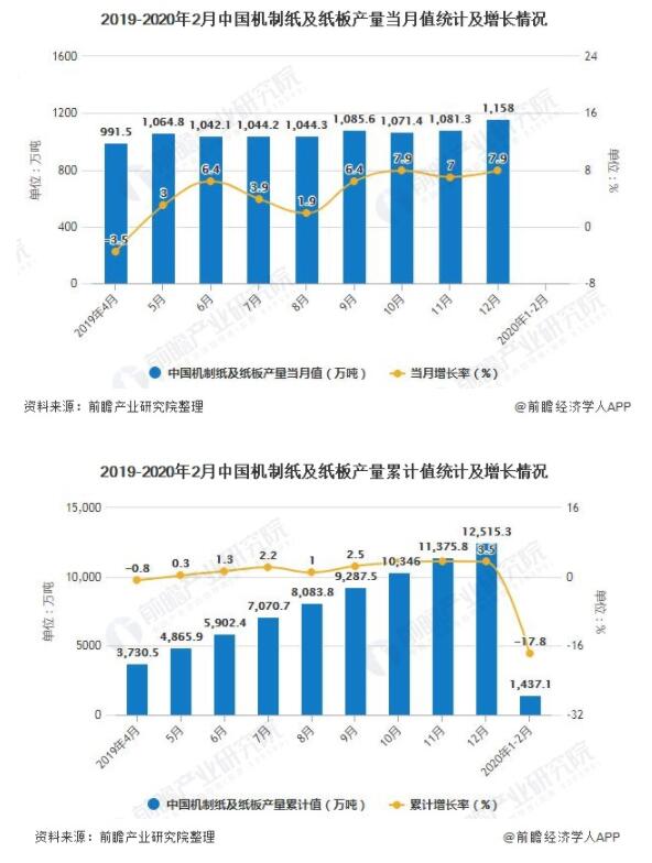 2020年1-2月中國機制紙及紙板產量超1400萬噸