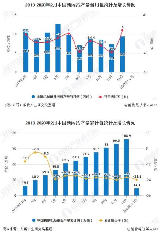 2020年1-2月中國新聞紙產量超14萬噸