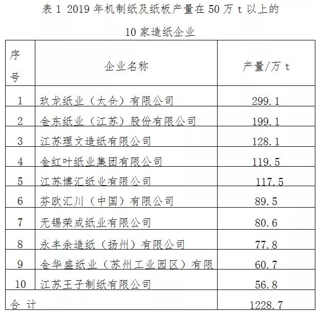 2019年江蘇省機制紙及紙板年產200萬t以上的企業(yè)有1家;年產100萬~200萬t的企業(yè)有4家;年產50萬~100萬t的企業(yè)有5家;年產10萬~50萬t的企業(yè)有10家。