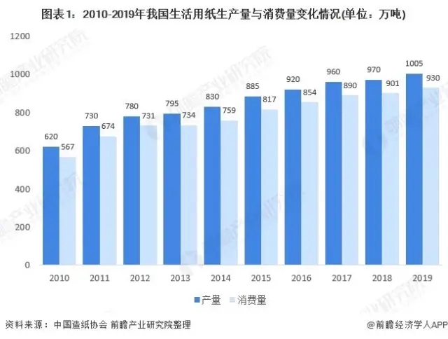 根據(jù)中國造紙協(xié)會在歷年《造紙工業(yè)年度報告》中披露的數(shù)據(jù),2010-2019年我國生活用紙的生產(chǎn)量與消費(fèi)量整體上呈現(xiàn)逐年增長的態(tài)勢。2019年,我國生活用紙產(chǎn)量為1005萬噸,較2018年增長3.61%;消費(fèi)量為930萬噸,較2018年增長3.22%。