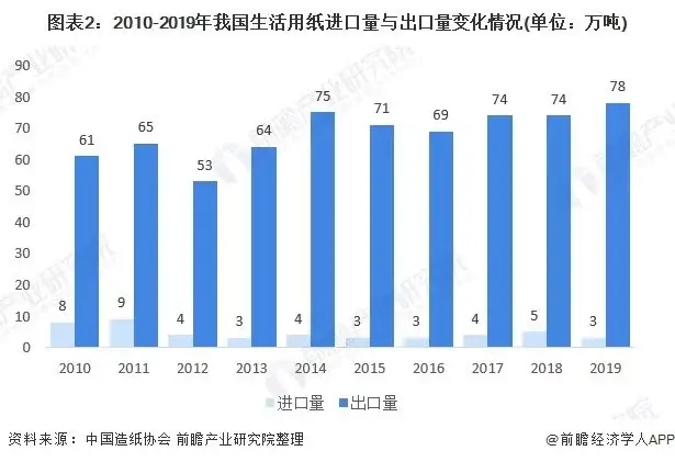 2010-2019年,我國生活用紙進(jìn)口數(shù)量較少,出口數(shù)量整體上呈現(xiàn)波動增長態(tài)勢,出口量遠(yuǎn)高于進(jìn)口量。2019年,我國生活用紙進(jìn)口量為3萬噸,較2018年減少了2萬噸;出口量實(shí)現(xiàn)78萬噸,較2018年增長了4萬噸。