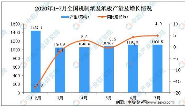 根據(jù)中國(guó)輕工業(yè)信息中心數(shù)據(jù)顯示,2020年1-7月,全國(guó)機(jī)制紙及紙板產(chǎn)量6843.8萬(wàn)噸,同比下降3.3%。7月當(dāng)月,全國(guó)機(jī)制紙及紙板產(chǎn)量1106.5萬(wàn)噸,同比增長(zhǎng)4.9%。