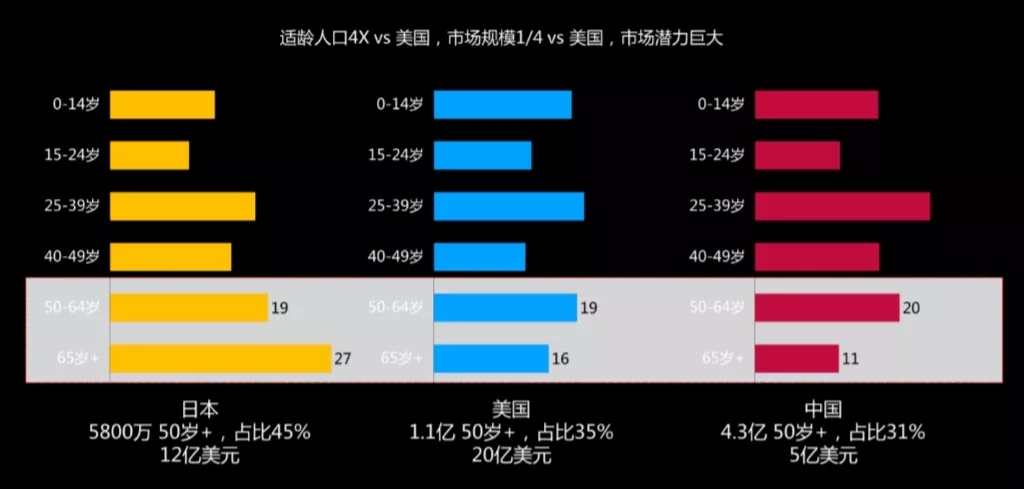 舉個(gè)例子,2017年中國(guó)50+人口是4.3億人,是美國(guó)同年50+人口的4倍(美國(guó)為1.1億),但是2017年中國(guó)中老年護(hù)理行業(yè)市場(chǎng)規(guī)模為5億美元,美國(guó)為20億美元。中國(guó)還有多大的市場(chǎng)潛力沒(méi)有釋放出來(lái)?