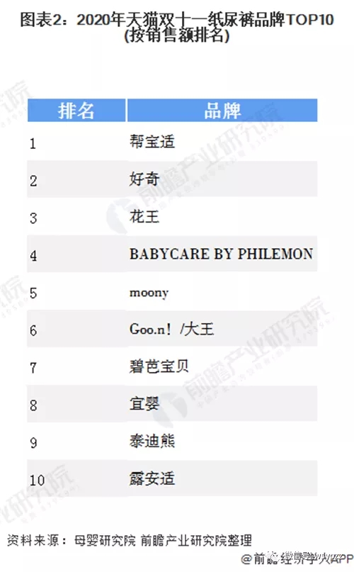 作為母嬰領(lǐng)域剛需、高頻的消費(fèi)類目,紙尿褲需求量巨大,由于父母對(duì)于嬰幼兒健康愈發(fā)重視,消費(fèi)者對(duì)于紙尿褲的品牌同樣重視。2020年天貓雙十一嬰童尿褲品牌TOP10中,幫寶適毫不疑問依然位居首位。