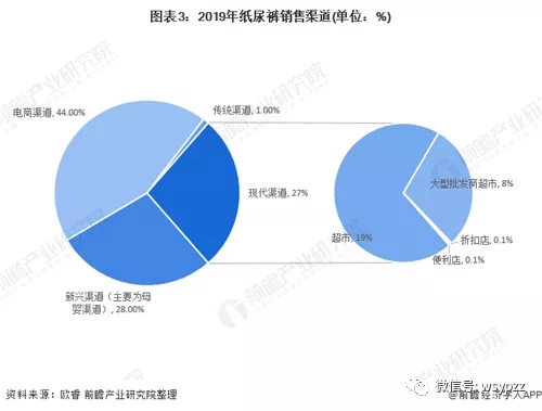 但是對(duì)于中國(guó)紙尿褲品牌,無論是市場(chǎng)層級(jí)提升或下沉,都需要在渠道中有符合自身發(fā)展的定位。隨著互聯(lián)網(wǎng)、5G、人工智能等技術(shù)的發(fā)展,電商渠道、新興渠道逐漸占據(jù)主要銷售渠道。據(jù)歐睿數(shù)據(jù),2019年紙尿褲銷售渠道中,電商渠道占比44%;新興渠道主要為母嬰渠道占比28%。