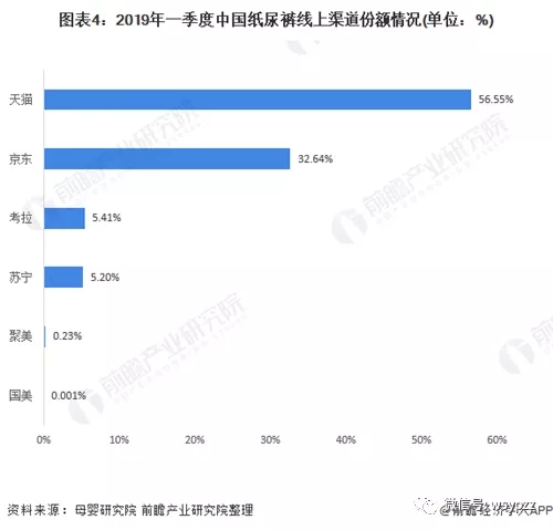 可見,線上渠道是紙尿褲銷售的重要渠道。2019年第一季度,紙尿褲銷售額達(dá)48.1億元,同比增長(zhǎng)12.6%。其中天貓平臺(tái)保持其“一哥”優(yōu)勢(shì),銷售額27.2億元,占比56.5%。京東平臺(tái)銷售額15.7億元,占比32.6%,同比增長(zhǎng)6.1%。在增長(zhǎng)率上,考拉出現(xiàn)了20.2%的負(fù)增長(zhǎng),蘇寧實(shí)現(xiàn)了214.8%的超高速增長(zhǎng)。