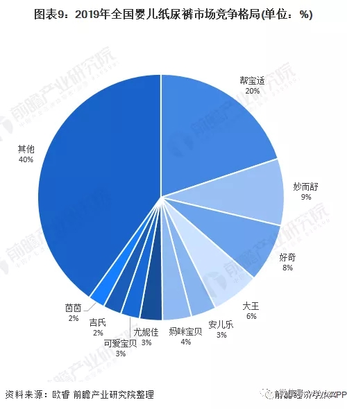2019年全國(guó)嬰兒紙尿褲市場(chǎng)中,幫寶適以20%的市場(chǎng)份額遠(yuǎn)超其他品牌。排名前十的品牌市場(chǎng)份額為60%,品牌眾多,市場(chǎng)競(jìng)爭(zhēng)相對(duì)激烈。