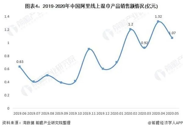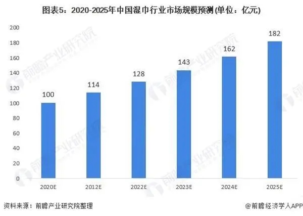 另一方面,2019年底全國疫情的爆發(fā)極大地刺激了濕巾的消費需求。2020年1-5月,阿里濕巾線上銷售額均在1億元左右,2020年4月銷售額更是高達(dá)1.32億元,2020年2月環(huán)比增速達(dá)到113.63%。此次“新冠疫情”較2003年非典更加嚴(yán)重,進(jìn)一步激化了國人對衛(wèi)生健康的關(guān)注。同時,隨著我國經(jīng)濟積極向好,居民消費能力及意愿不斷提升,企業(yè)不斷探索制造多元化的濕巾,后疫情時代我國濕巾行業(yè)發(fā)展前景更為明朗,預(yù)計2025年市場規(guī)模有望達(dá)到182億元。