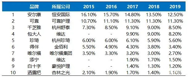 在企業(yè)數(shù)量上,2018年統(tǒng)計(jì)在冊(cè)的成人失禁用品生產(chǎn)企業(yè)有448家。本土廠商包括杭州可靠、恒安國際、豪悅護(hù)理等,外資廠商包括金佰利、尤妮佳等。目前成人失禁用品以國內(nèi)品牌為主,2019年國內(nèi)品牌恒安國際安爾康、杭州可靠、杭州舒泰千芝雅市占率分別為12.5%、11.3%、8.5%,占據(jù)前三。