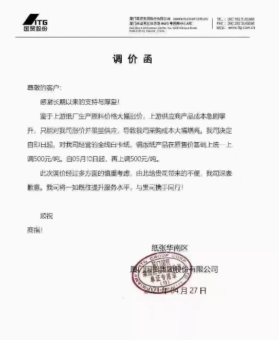 廈門國(guó)貿(mào)紙張華南區(qū):即日起,對(duì)我司經(jīng)營(yíng)的全線白卡紙、銅版紙產(chǎn)品在原售價(jià)基礎(chǔ)上統(tǒng)一上調(diào)500元/噸。自5月10日起,再上調(diào)500元/噸。