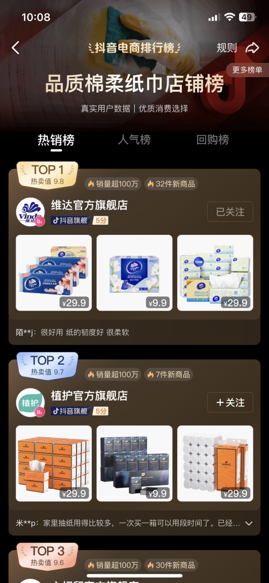 以生活用紙品牌維達(dá)為例,截至2023年7月25日,據(jù)抖音平臺(tái)直播動(dòng)態(tài)顯示,維達(dá)官方旗艦店今年上半年累計(jì)直播場(chǎng)次已超過(guò)200場(chǎng)。從最新的抖音電商排行榜來(lái)看,維達(dá)官方旗艦店已經(jīng)在“品質(zhì)綿柔紙巾店鋪熱銷榜”上排名第一。而店內(nèi)居銷量榜首的爆品手帕紙更是售出達(dá)到253.6萬(wàn)件。其中排名前五的品類分別為手帕紙、卷芯紙和抽紙,手帕紙獨(dú)占前三名。