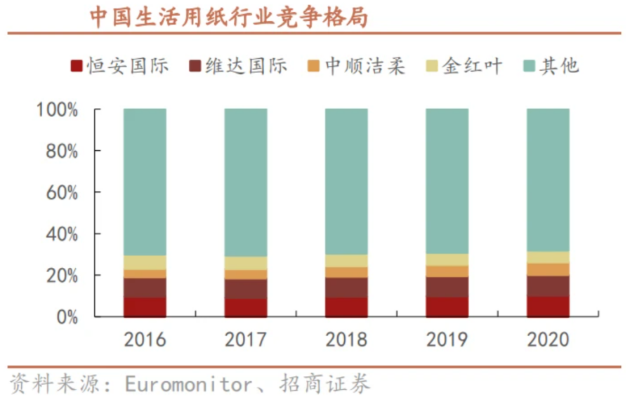 據(jù)招商證券研報(bào)顯示,2020 年中國(guó)生活用紙行業(yè)四巨頭恒安國(guó)際、維達(dá)國(guó)際、中順潔柔、金紅葉的市場(chǎng)占有率分別為 10.2%、10.0%、6.0%、5.7%,但行業(yè) CR4 僅為 31.9%,集中度仍有提升空間。那么,占據(jù)頭部一席的維達(dá)國(guó)際在提升市場(chǎng)份額上還能做些什么?