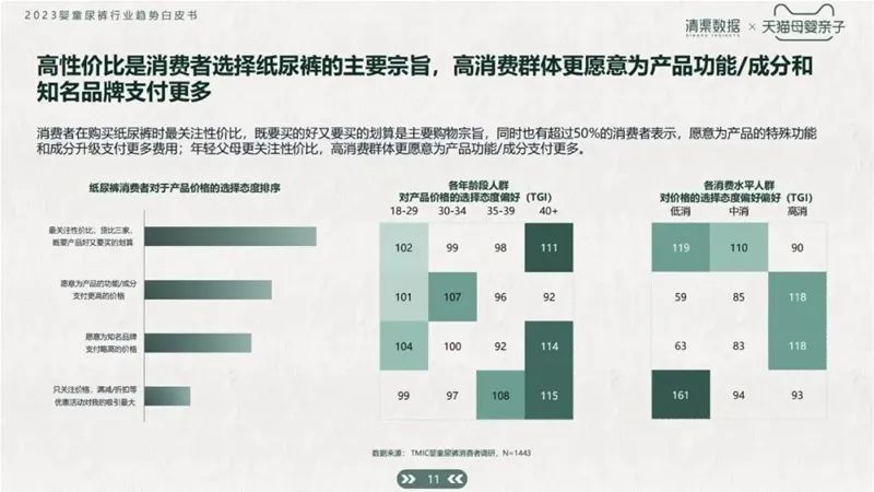 根據(jù)白皮書數(shù)據(jù)顯示,消費(fèi)者在購(gòu)買紙尿褲時(shí)最關(guān)注性價(jià)比,“又好又劃算”是主要購(gòu)物宗旨,同時(shí)也有超過(guò)50%的消費(fèi)者表示,愿意為產(chǎn)品的特殊功能和成分升級(jí)支付更多費(fèi)用:年輕父母更關(guān)注性價(jià)比,高消費(fèi)群體更愿意為產(chǎn)品功能/成分支付更多。