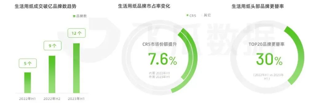 據(jù)飛瓜統(tǒng)計(jì),2023上半年抖音平臺(tái)成交破億的生活用紙品牌數(shù)已超過(guò)12個(gè),較22年同期增加7個(gè)。其中,CR5品牌市場(chǎng)份額為34%,較22年同期增長(zhǎng)7.6%,頭部品牌集中度進(jìn)一步提高。